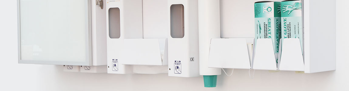 Das formschöne Infratronic Solutions Slimline XS Schranksystem erlaubt eine platzsparende Positionierung von zwei Spendern und einem Falthandtuchpapiermodul.