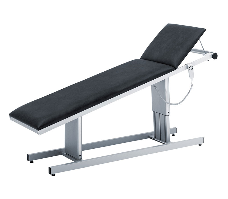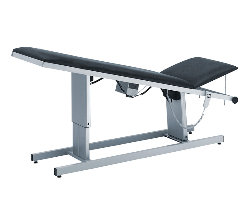 Zwei geräuscharme Hubsäulen ermöglichen eine stufenlose Verstellung und werden über einen Transformator betrieben. Dadurch lässt sich nicht nur die Höhe regulieren, sondern auch eine exakte Neigung in Trendelenburg- und Anti-Trendelenburg-Position mit einem Winkel von jeweils 11 Grad einstellen. Die zweiteilige Liegefläche und das Kopfteil mit 64 mm Polsterstärke gewährleistet Stabilität, Sicherheit und Komfort bei der Lagerung des Patienten. Das Kopfteil lässt sich mechanisch bis +40° verstellen.