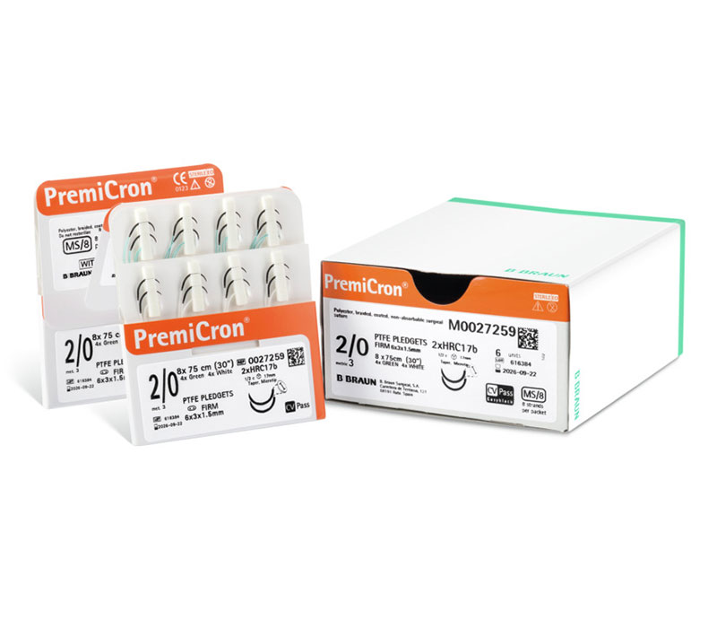 B.Braun PremiCron® ist ein synthetisches, nicht resorbierbares, geflochtenes Multifilament bestehend aus Polyesterfasern. PremiCron® Nahtmaterial ist gleichmäßig mit Silikon beschichtet, um das Gleitverhalten und damit das Handling zu verbessern.
