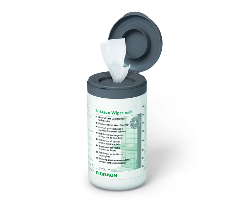 Das B.Braun Wipes mini ECO Vliestuch-Spendersystem zum Befüllen mit B.Braun Desinfektionsmitteln bietet eine hygienische Entnahme und Aufbewahrung von B.Braun Wipes.