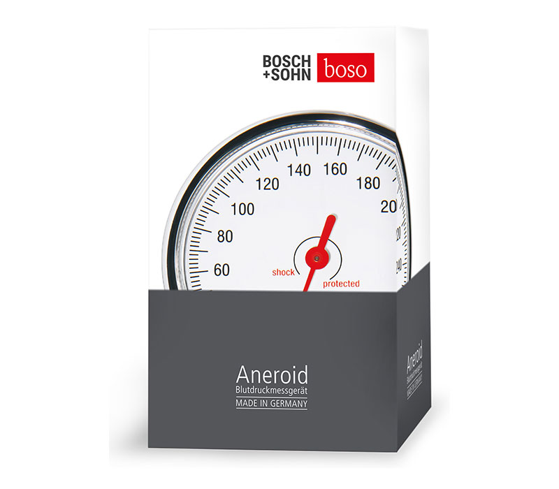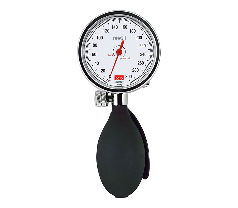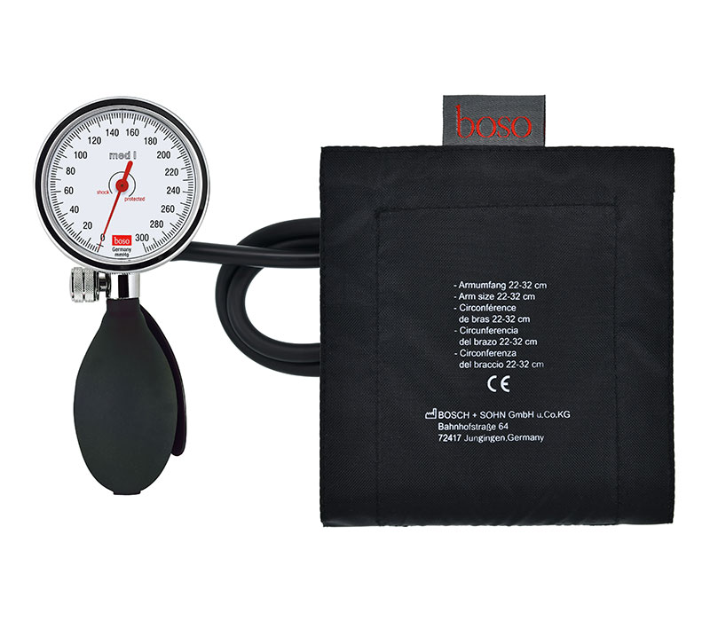 Das boso med I Aneroid-Blutdruckmessgerät mit integriertem Stethoskop und latexfreier Zugbügel-Klettmanschette dient der manuellen Blutdruckmessung am Oberarm. Es bietet eine Genauigkeit der Druckanzeige von ca. 3 mmHg über den gesamten Messbereich von 0 – 300 mmHg.
