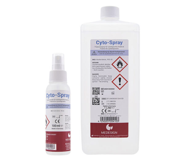 Das Cyto-Spray Fixative Fixationsspray dient zur schnellen und einwandfreien Fixierung von Zellabstrichen. Dies ist eine der wesentlichen Voraussetzungen für eine genaue zytologische Interpretation. Der Pumpsprühmechanismus ermöglicht eine sehr gleichmäßige Verteilung der alkoholhaltigen Flüssigkeit auf dem Objektträger. Nach dem Aufsprühen verdunstet der Alkoholanteil und der verbleibende Polyglycol-Schutzfilm schützt das Präperat optimal gegen Austrocknung und Beschädigung.