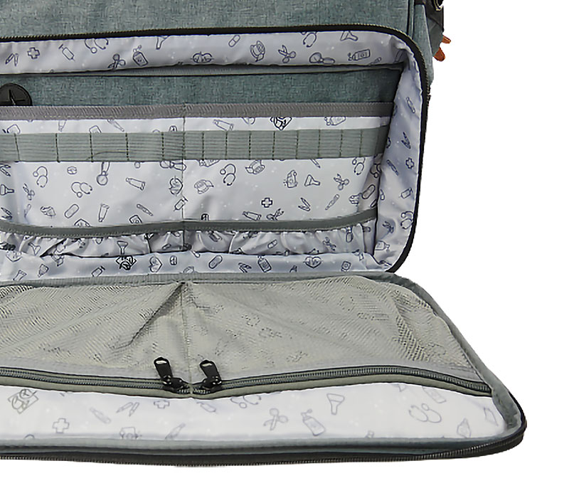 Eine 40 x 20 cm große Tasche auf der Vorderseite, die sich vollständig öffnen lässt, bietet mit zwei Reißverschluss-Netztaschen und zwei flachen Fächern mit mehreren elastischen Schlaufen zusätzlichen Stauraum zum Aufstellen von kleinen Utensilien wie Pinzette, Scheren, Stiftlampe, Bandagen, Stifte.