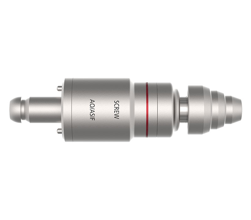 Der rot kodierte DePuy Synthes UNIUM Schraubaufsatz, ausgestattet mit einer AO/ASIF-Schnellkupplung, ist auf das kontrollierte und kraftvolle Einbringen von Schrauben ausgelegt. Die maximale Drehzahl von 340 U/min ist bewusst niedrig gehalten, um in Kombination mit einem hohen Drehmoment eine maximale Kontrolle während des Schraubvorgangs zu gewährleisten.