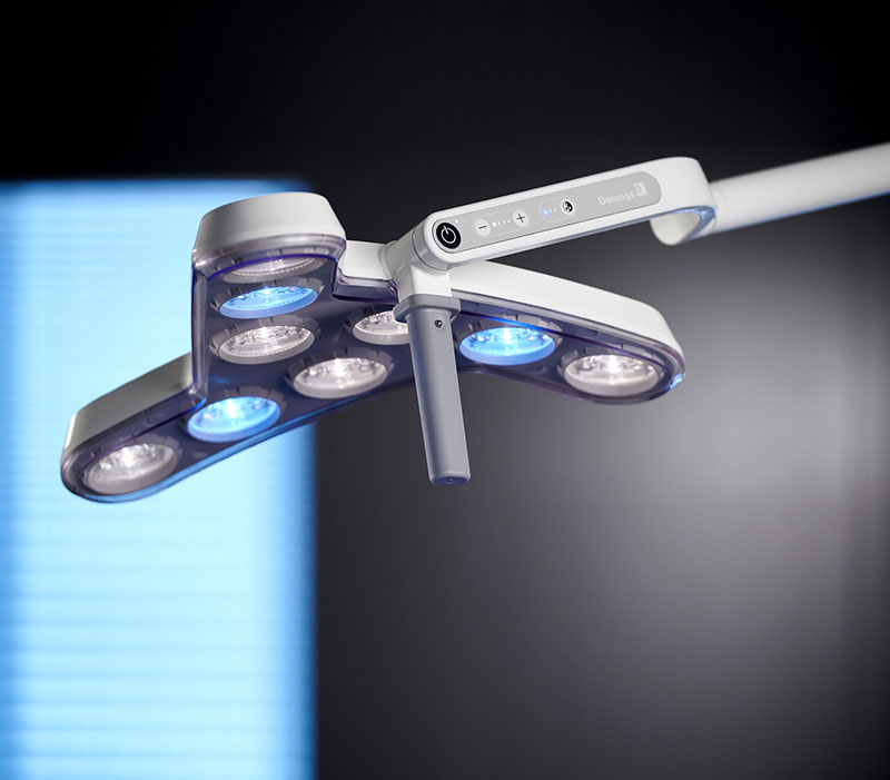 Durch ihre robuste Konstruktion ist die TRIANGO FOKUS 100-3 LED-Operationsleuchte von Derungs besonders geeignet für Arztpraxen, Kliniken und Operationssäle. Ihre hohe Funktionalität wird durch ein ansprechendes ästhetisches Design ergänzt, was durch den renommierten Red Dot Design Award bestätigt wird.