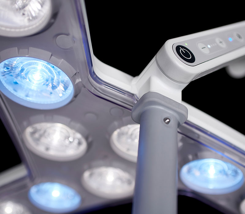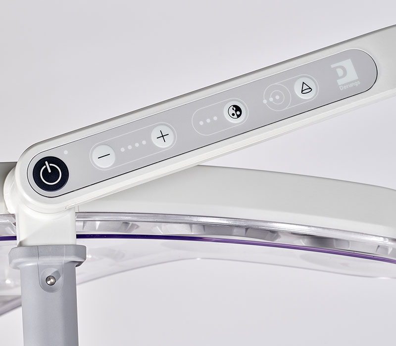 Die hygienische Folientastatur ermöglicht die stufenlose Anpassung der Lichtintensität bei einstellbaren Farbtemperaturen von etwa 3.700K, 4.300K und 4.700K. Modernste LED-Technologie sorgt für klares, flimmerfreies Licht mit hervorragender Farbwiedergabe. Das homogene, schattenfreie Beleuchtungsfeld kann flexibel auf Durchmesser von 18, 23 oder 25 cm (bei einem Meter Abstand) eingestellt werden und bietet eine Ausleuchtungstiefe von 80 cm.