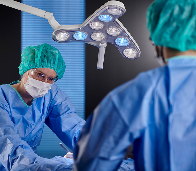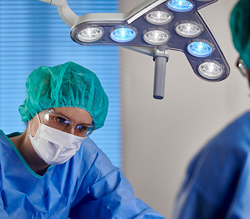 Die TRIANGO FOkUS 100-3 LED OP-Leuchte von Derungs mit exzellentem Licht, 100.000 Lux, 3 Farbtemperaturen und variablem Beleuchtungsfeld – für höchste Ansprüche.