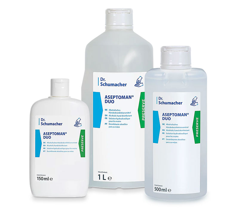 Dr. Schumacher Aseptoman DUO Händedesinfektionsmittel ist begrenzt viruzid PLUS und mit rückfettenden Inhaltsstoffen angereichert, die eine Austrocknung der Haut vermindern.