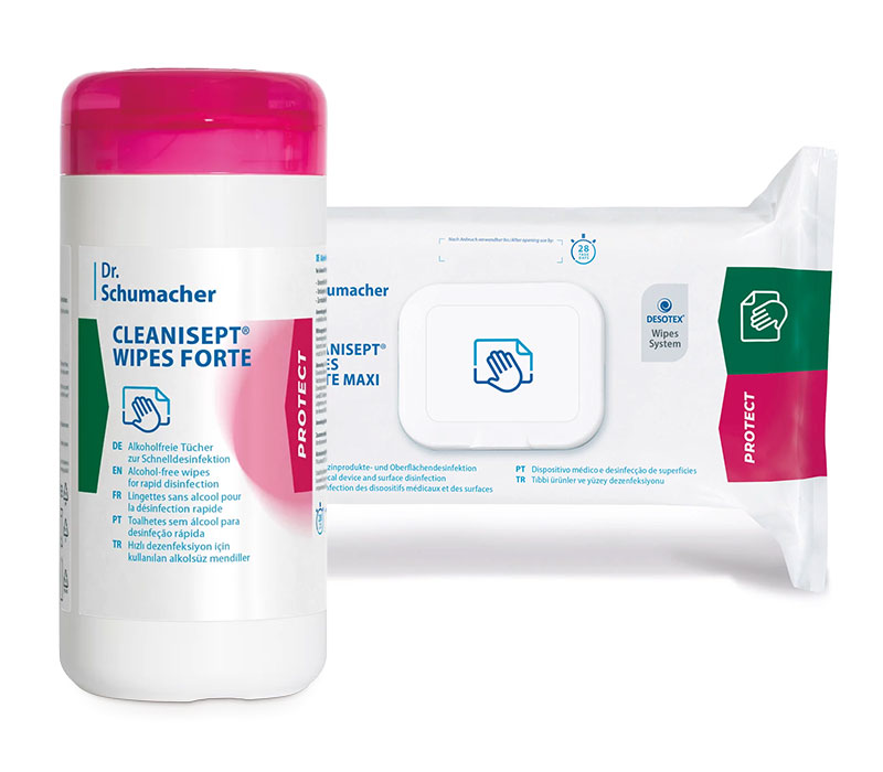 Die schnell und umfangreich wirkenden Dr. Schumacher Cleanisept Wipes forte eignen sich bestens für die Desinfektion alkoholempfindlicher Flächen.