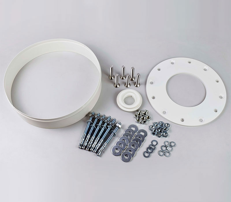 Im Set sind die Deckenscheibe, ein Flansch mit 3 Befestigungspunkten, Ankerbolzen und verschiedene Befestigungsmaterialien enthalten (siehe Lieferumfang).