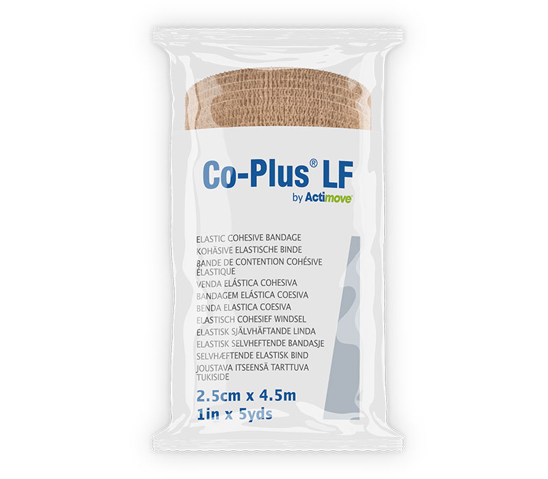 Essity / BSN Co-Plus LF Actimove kohäsive Fixierbinde ist in den Farben Beige und Weiß sowie als Multicolor-Pack in Schwarz, Blau, Neongrün, Pink, Rot und Türkis in verschiedenen Größen erhältlich.