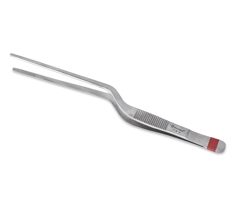 Die Fuhrmann Einmal-Pinzette nach Jansen besitzt eine bajonettförmige Krümmung und wird vielseitig bei der Behandlung von Wunden eingesetzt. Die Pinzette eignet sich zum Fassen und Halten von Gewebe und Hilfsmitteln wie z.B. Nähten und gelangt durch die Biegung auch in tiefe Strukturen.
