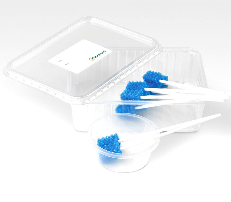 Jedes Set ist steril verpackt und enthält neben den 10 Mundpflegestäbchen eine 500 ml Kunststoffschale mit Deckel, eine weitere Kunststoffschale mit 120 ml sowie ein Etikett zur Patientenidentifikation. Dieses dient der eindeutigen Zuordnung und verhindert Verwechslungen im klinischen Alltag.