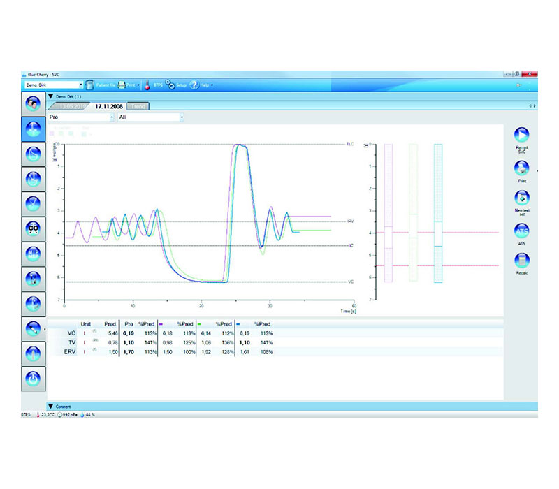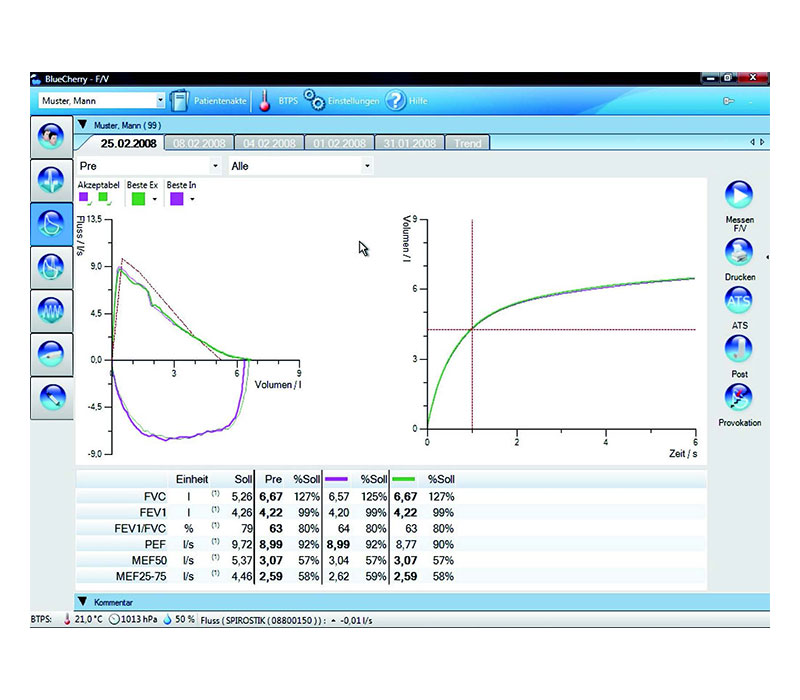Die Software integriert die Qualitätskontrolle nach ATS/ERS-Richtlinien und enthält Algorithmen zur Spirometrie-Interpretation sowie proprietäre Grafiken. Die Unterstützung der GLI-Prognosewerte (2012 und 2017) und Z-Scores ermöglicht eine präzise Bewertung. Eine Langzeit-Testtrendanalyse mit der Möglichkeit, mehrere Tests übereinanderzulegen, erleichtert die Verlaufsbeobachtung. Die Berichte lassen sich individuell anpassen.