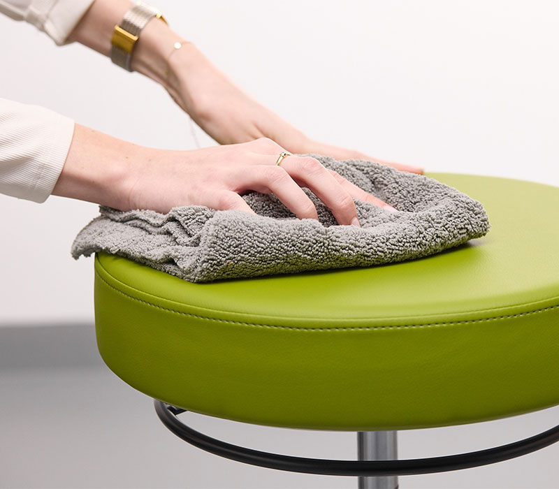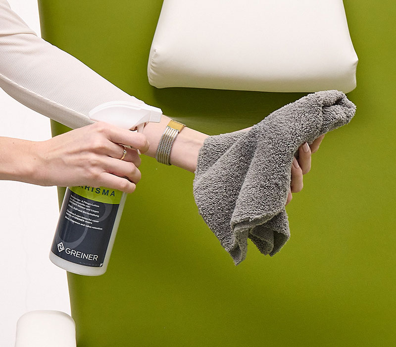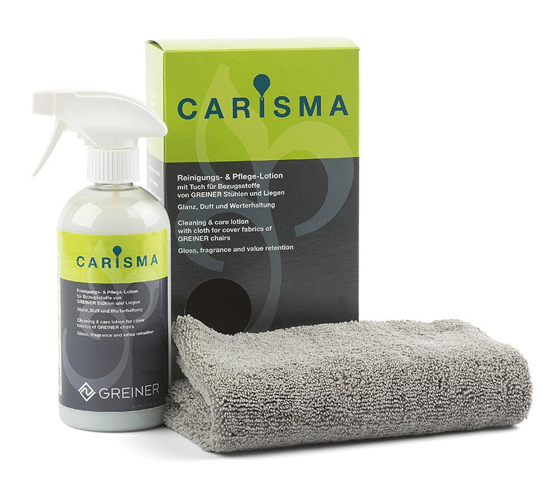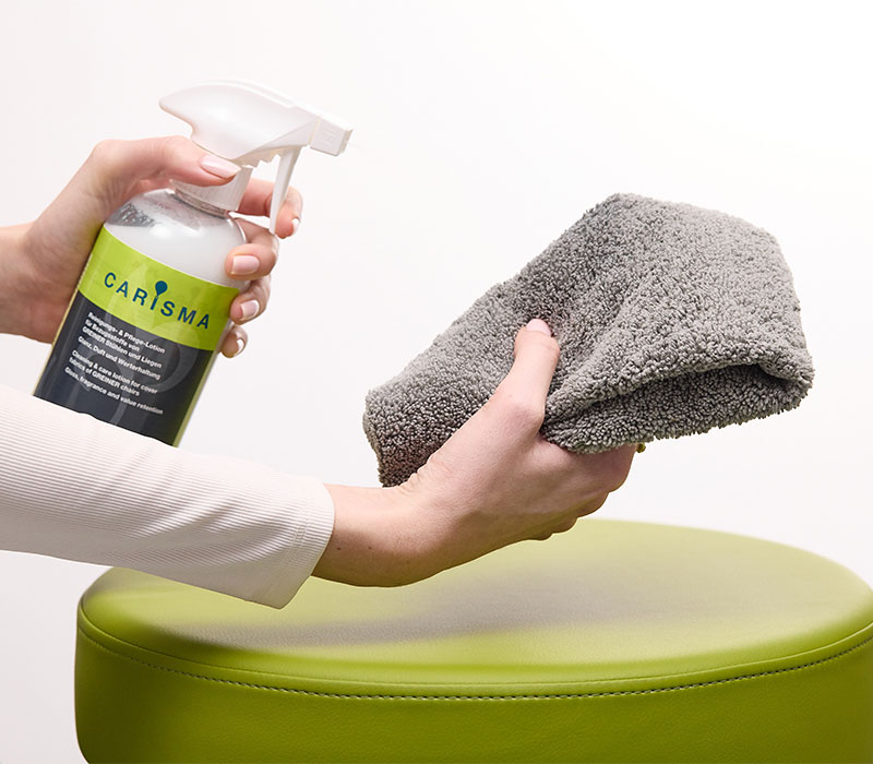 Das Reinigungs- und Pflegeset Carisma von Greiner wurde entwickelt, um speziell Kunstlederoberflächen von Stühlen und Behandlungsliegen gründlich zu reinigen und zu pflegen.