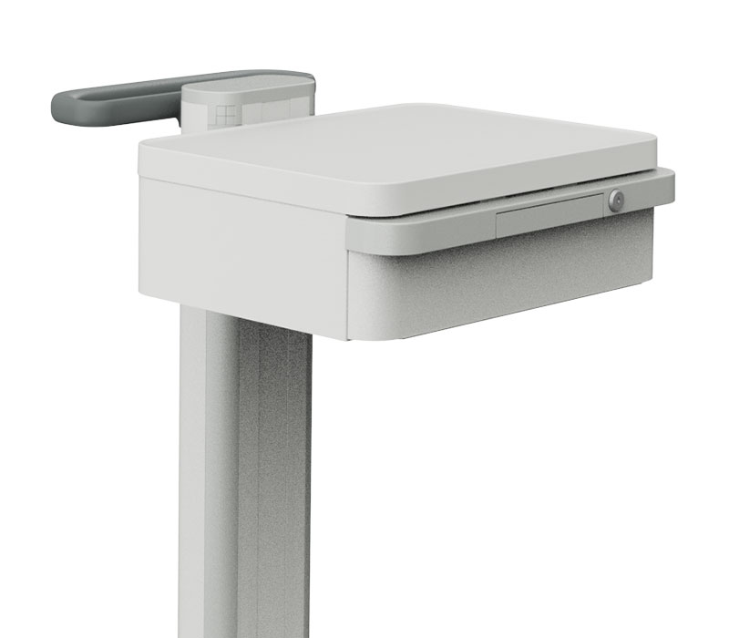1 Trägerprofil 747mm, mit abschließbarer Seitentüre | 1 Ablageplatte, Aluminium-Druckguss, 467x349mm (BxT), 1 Schublade Metall, abschließbar, mit ISO-Modulkorb |