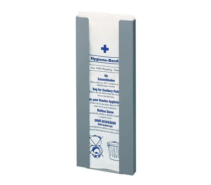Die Haeberle Wandhalterung zur praktischen Entnahme des Hygienebeutels, für die Entsorgung von Damenbinden zur angemessenen Hygiene in öffentlichen Toiletten.