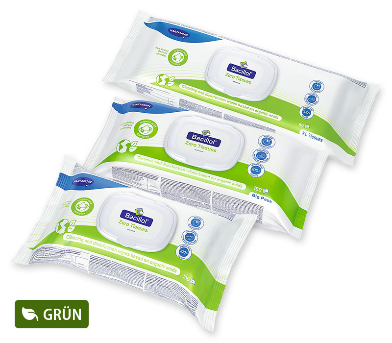 Die Hartmann Bacillol Zero Tissues sind nachhaltige und gebrauchsfertige Desinfektionstücher für empfindliche Oberflächen – sie verringern den CO2-Fußabdruck um 75%.