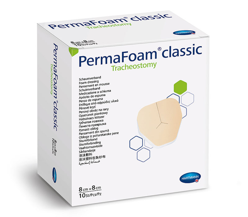 Der hydrophile Hartmann PermaFoam classic Tracheostomy Schaumverband liefert bestmöglichen Schutz und verlässliche Fixierung von Kanülen und Sonden.