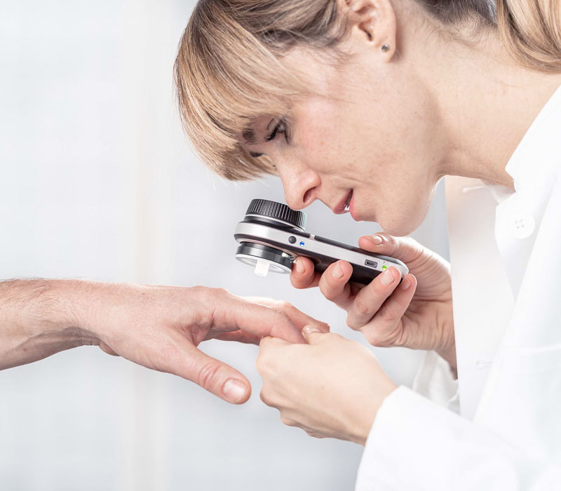 Das kompakte Heine DELTAone LED-Dermatoskop bietet eine 10-fache Vergrößerung für präzise Untersuchungen und verfügt über einen zuverlässigen Li-Ion-Akku.