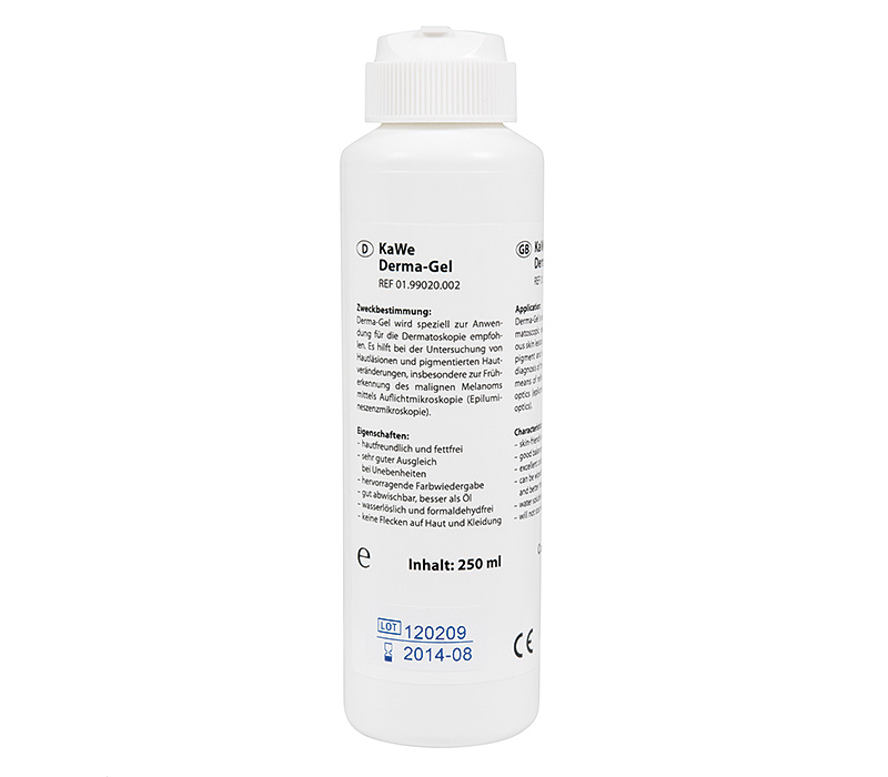 Das praktische KaWe Derma-Gel eignet sich für die professionelle Dermatoskopie. Durch Benetzen mit dem speziellen Dermatoskop-Gel werden Hautreflexe vermieden und das störende Hautrelief unsichtbar gemacht, so dass nur noch die reine Hautverfärbung erkennbar ist.