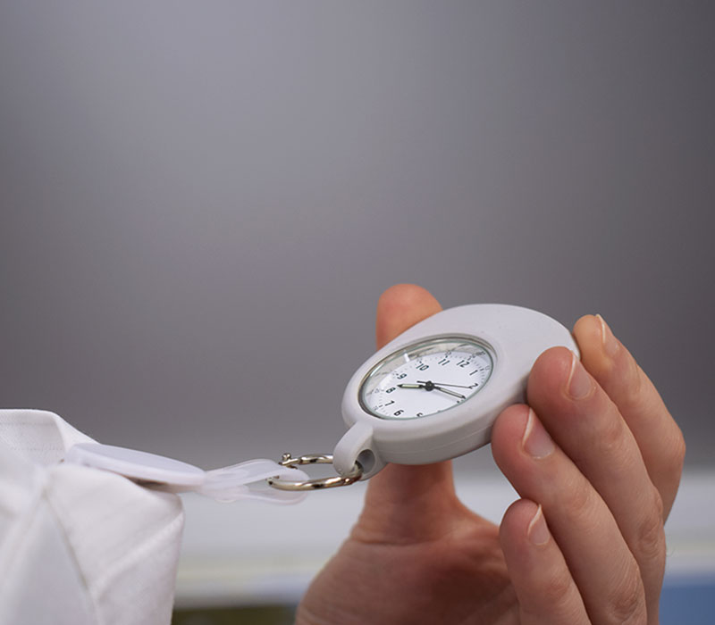 Das drehbare Ziffernblatt mit 12- und 24-Stunden-Skalierung sowie deutlich sichtbarem Sekundenzeiger ermöglicht eine präzise Zeitkontrolle – z. B. bei der Pulsmessung oder Medikamentengabe. Das spritzwassergeschützte, stoßfeste Gehäuse schützt das Uhrwerk im anspruchsvollen Pflegealltag zuverlässig. Ein robustes Mineralglas sorgt für klare Sicht und hohe Langlebigkeit.