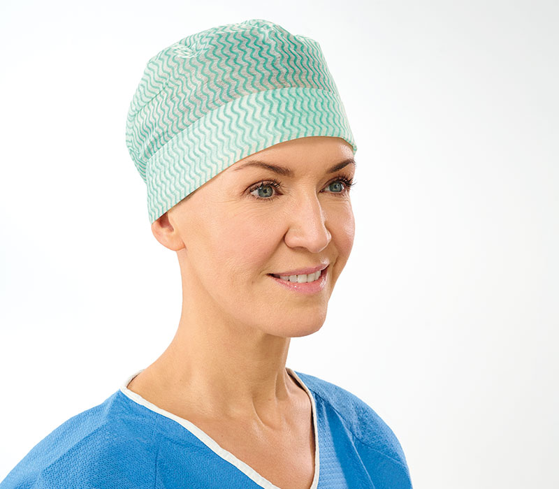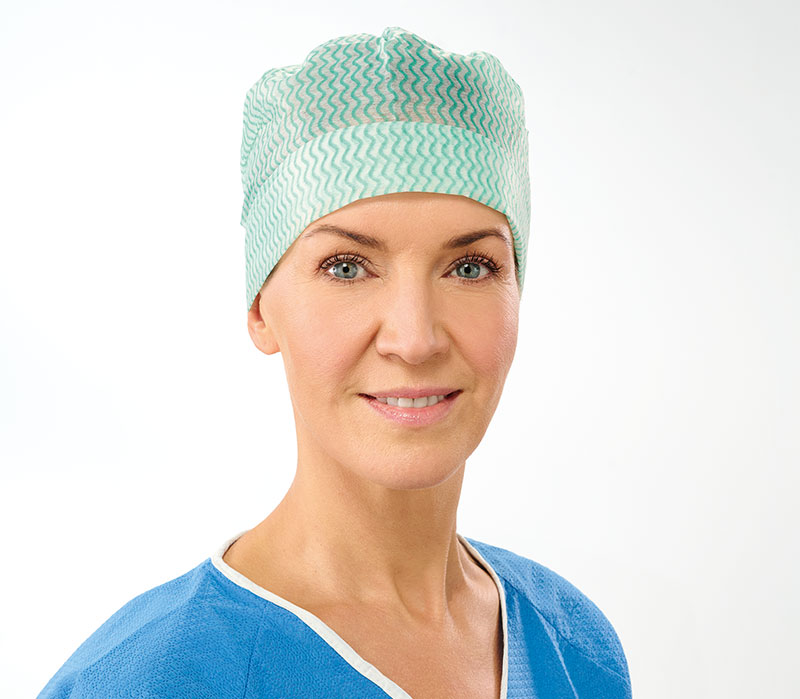 Die Lohmann & Rauscher Sentinex Nova OP-Hauben mit umschlagbarem Rand im Stirnbereich als Schweißband sind variabel tragbar und eignen sich ideal für mittlere Haarlängen.