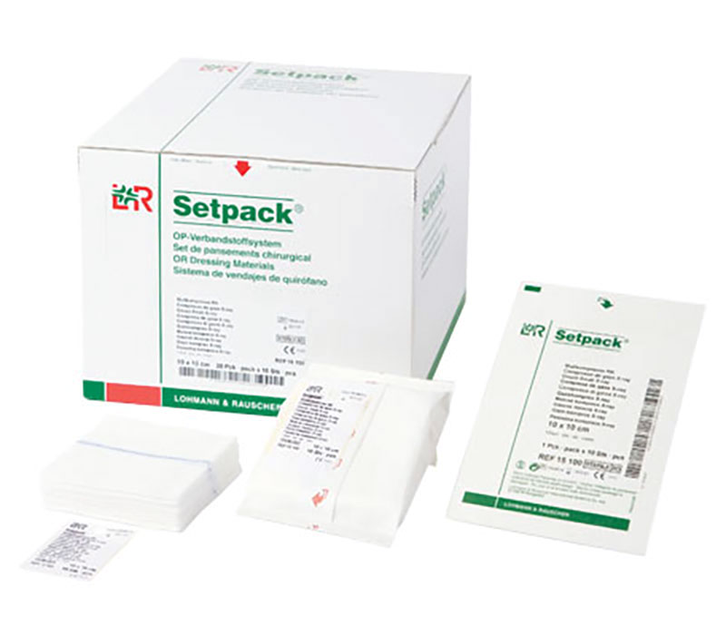 Die sterilen Lohmann & Rauscher Setpack Mullkompressen RK sind röntgenkontrastfähige OP-Kompressen zur Blutstillung und Flüssigkeitsaufnahme bei chirurgischen Eingriffen.