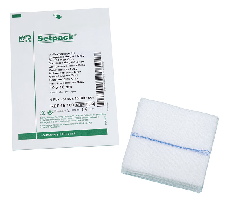 Die Lohmann & Rauscher Setpack Mullkompressen RK sind für die Verwendung bei chirurgischen Prozeduren ausgelegt. Sie bestehen aus 100 % Verbandmull gemäß DIN EN 14079 und sind mit einem blauen Röntgenkontrastfaden aus Polypropylen, Polyester und Bariumsulfat ausgestattet. Dies ermöglicht eine zuverlässige Detektion mittels bildgebender Verfahren.