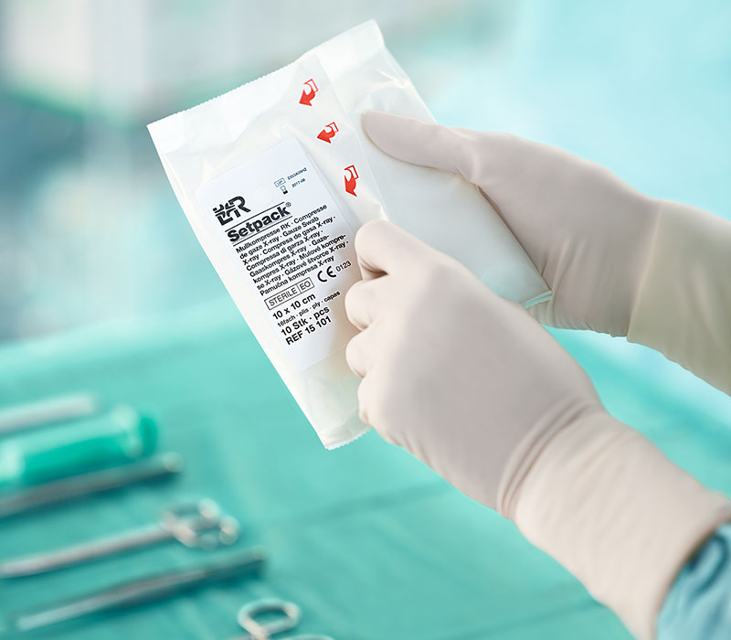 Eine patentierte Sterilgut-Innenumhüllung gewährleistet die schnelle und kontaminationsfreie Entnahme im OP. Für eine lückenlose Zählkontrolle sind doppelte, selbstklebende Zählkarten integriert. Dadurch wird das Risiko einer Retention von Kompressen (Gossypibom) signifikant minimiert.