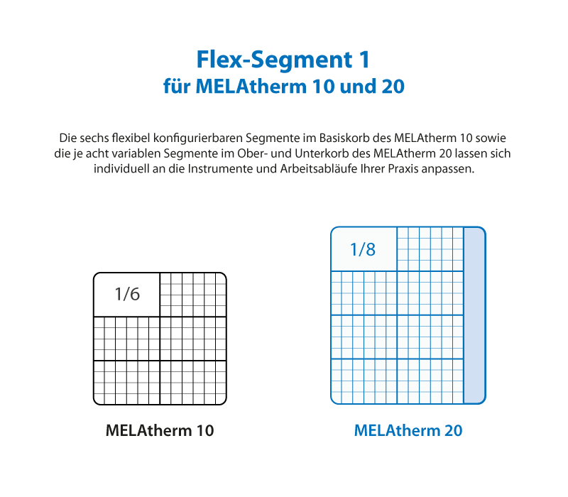 Der Aufsatz wird mittels der beiden im Lieferumfang enthaltenen Halteklammern zuverlässig auf den gewählten Flexkorb fixiert. Die kompakte Bauweise entspricht 1/6 des Basiskorbs im Melatherm 10 und 1/8 im Melatherm 20 und ermöglicht eine platzsparende Kammerbelegung.