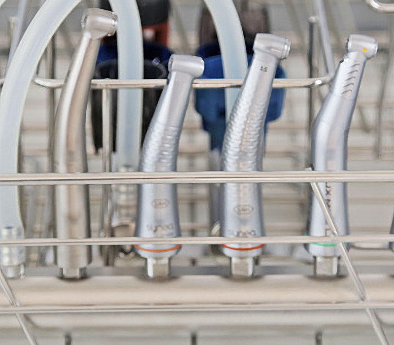 Melag Basiskorb mit 6 Flex‑Segmenten auf zwei Ebenen und Injektorschiene mit 11 Blindschrauben zur flexiblen Adapterbestückung zur strukturierten Hohlkörperaufbereitung.