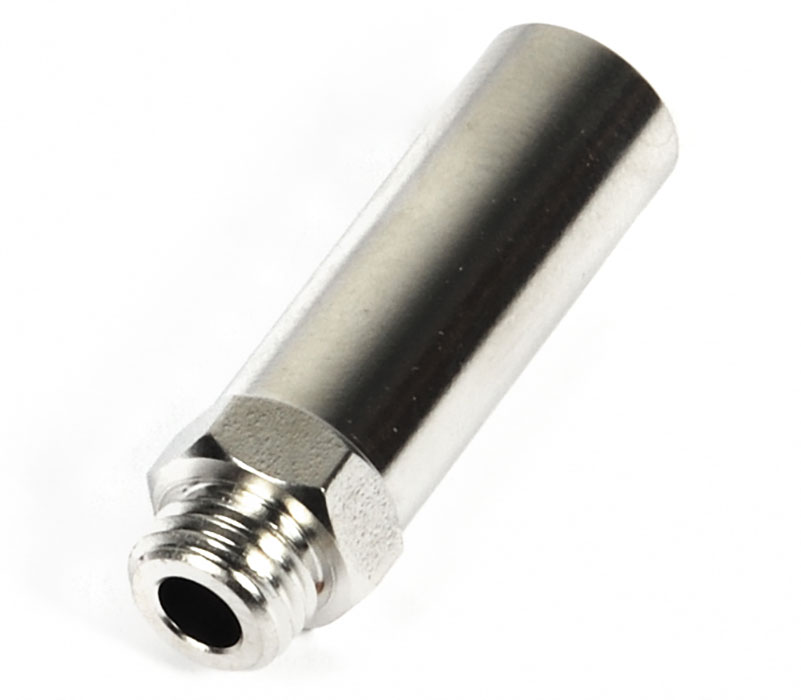 Die Distanzhülse wird auf die Bohrungen der Injektorschiene aufgeschraubt und mit einem Maulschlüssel fixiert. Bei Verwendung von mehr als sechs Adaptern oder Verteilern ist für jeden zusätzlichen Anschluss eine Distanzhülse erforderlich.
