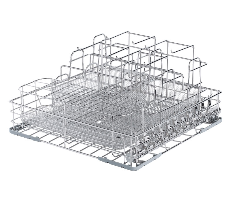Für Abdrucklöffel und Gelenkinstrumente (Scheren, Klemmen) stehen 4 Gestellhalterungen zur Verfügung. Diese Konfiguration gewährleistet eine validierte Aufbereitung der Medizinprodukte entsprechend den fachspezifischen Anforderungen der Kieferorthopädie.