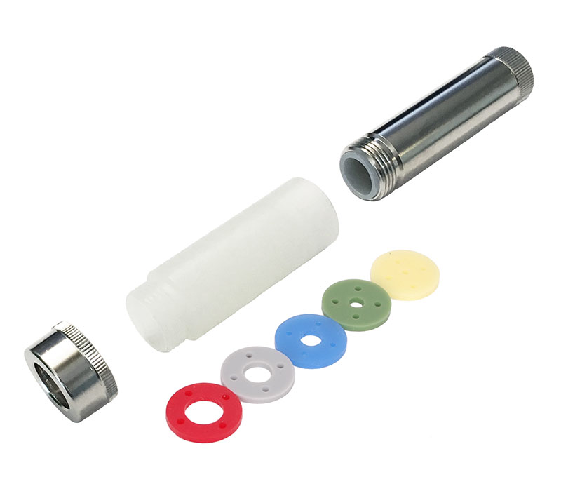 Das Melag Einzelfiltergehäuse inkl. Keramik-Filterscheibe (ME73905) ermöglicht den direkten Anschluss des Injektorkorb Flex 1 an Injektorschienen ohne Zentralfilter.