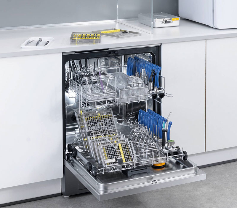 Die übersichtliche Anordnung der Instrumente bietet eine strukturierte Aufbereitung. Das Tray lässt sich komfortabel mit einer Hand öffnen und schließen und sorgt so für einen reibungslosen Arbeitsablauf in der Aufbereitungseinheit.