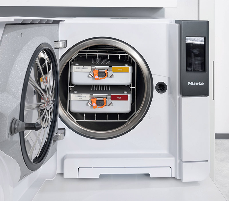 Der Arbeitsablauf gestaltet sich wie folgt: Instrumente werden in Trays im Miele Thermodesinfektor gereinigt und desinfiziert, im Anschluss an Reinigung und Desinfektion werden die Trays in die EasyStore Sterilcontainer eingelegt und verschlossen. Damit ist der Verpackungsvorgang bereits abgeschlossen und die medizinischen Instrumente können direkt im Autoklaven sterilisiert werden.