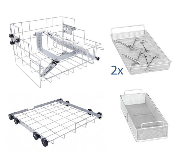 Der Unterkorb A 151 nimmt marktübliche DIN-Siebschalen sowie diverse Einsätze auf. Zudem sind 2 flache Siebschalen E 142 mit je 2 schwenkbaren Tragegriffen zum Einsatz verschiedener liegender Instrumente wie Scheren und Zangen enthalten. Im höheren Einsatz E 379 mit 2 Tragegriffen findet diverses Instrumentarium seinen Platz.