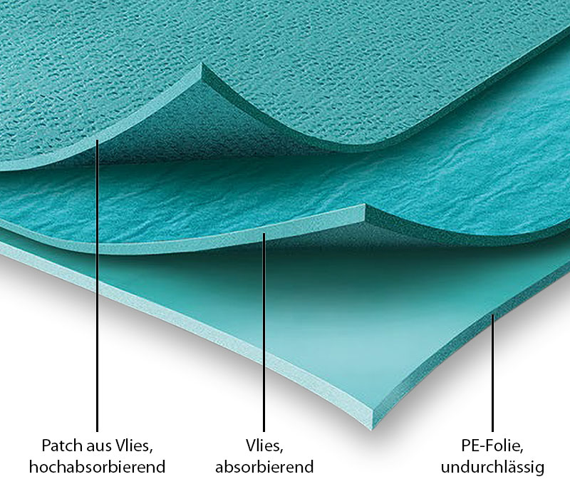 In den Sets enthaltene OP-Abdeckungen bestehen aus einem zweilagigen Laminat mit einem verstärkenden Patch, die eine undurchlässige und absorbierende Abdeckung über die gesamte Fläche gewährleistet. Damit ist eine Absorption bei höheren Flüssigkeitsmengen sichergestellt.
