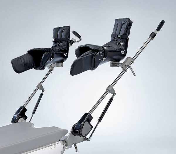 Der Schmitz Beinhalter UniLeg mit integrierter Seitenschienenaufnahme für DIAMOND und mobilis OP-Tische steht wahlweise mit oder ohne Peroneusschutz zur Verfügung. Dank der Gasfederunterstützung lässt sich die Höhe individuell anpassen und vom Fußende aus spreizen, um die ideale Positionierung während eines Eingriffs zu gewährleisten.