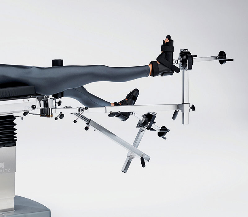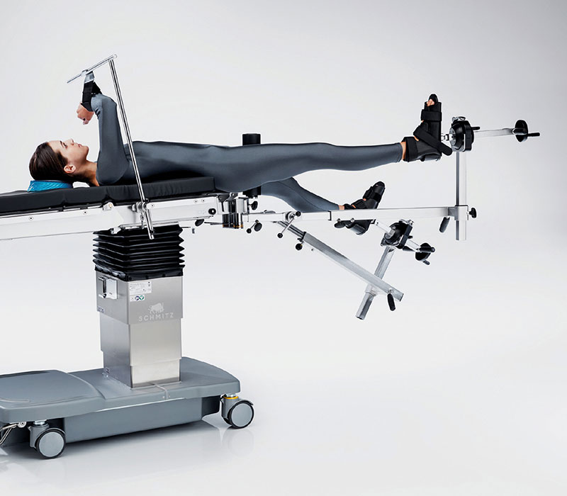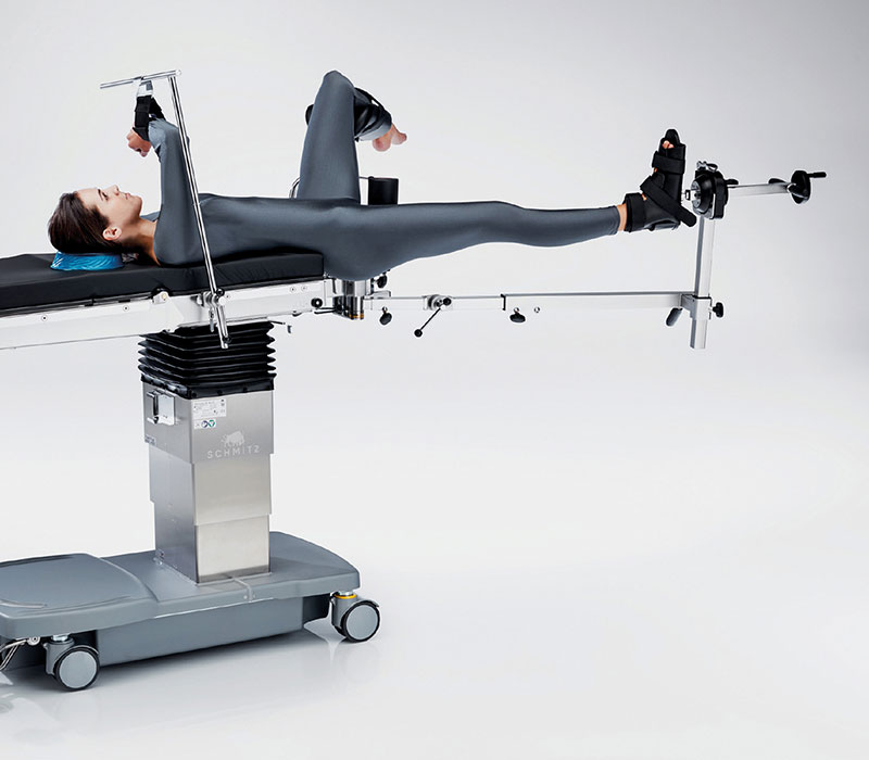 Das Schmitz Extensionsgerät für DIAMOND / mobilis OP-Tische ermöglicht präzise Patientenlagerung durch Doppelgelenke, verschiebbare Zugaggregate und variable Einstellmöglichkeiten.