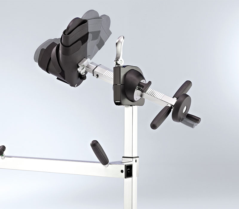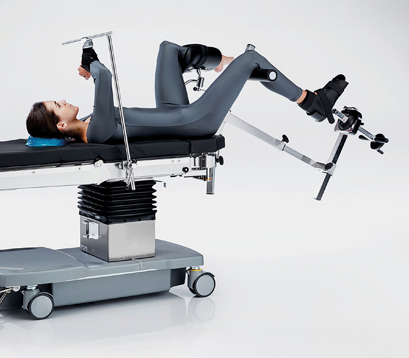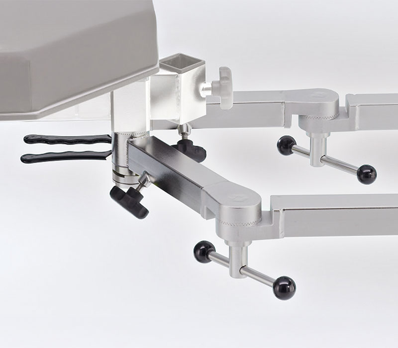 Die innovative Gelenkausführung im Holm kann wahlweise horizontal oder vertikal eingesetzt werden und gewährleistet dadurch eine deutlich verbesserte Röntgenzugänglichkeit während des operativen Eingriffs. Diese Flexibilität erleichtert bildgebende Verfahren erheblich und reduziert die Notwendigkeit von Umlagerungen.