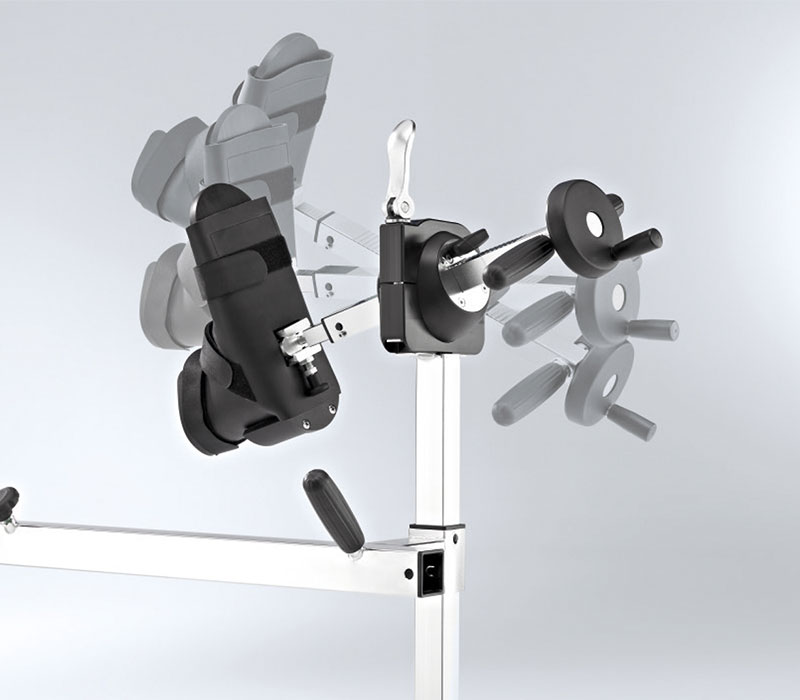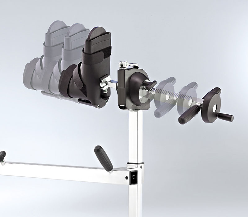 Die auf den Holmen verschiebbaren Zugaggregate verfügen über ein multifunktionales Gelenksystem mit Kipp-, Dreh- und Rotationsfunktion. Diese Bewegungsmöglichkeiten erlauben eine individuelle Anpassung an verschiedene anatomische Gegebenheiten und operative Erfordernisse.