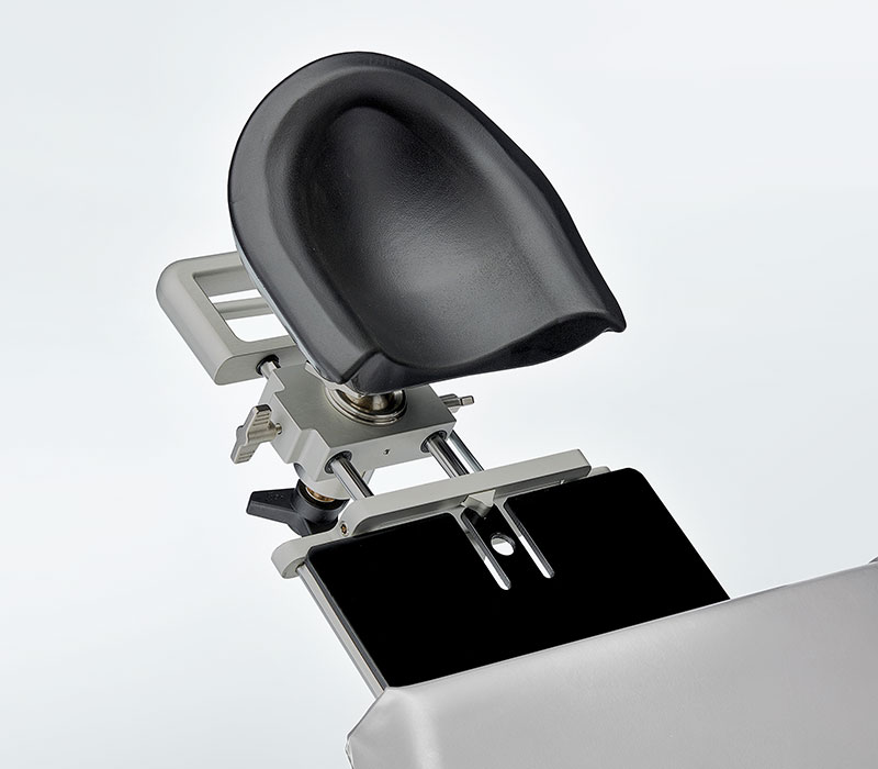 Die Kopfschale ist zweifach längenverstellbar zur individuellen Patientenadaption mit einem Verstellbereich der Längenvoreinstellung von 210 mm und einer Längenfeineinstellung von 70 mm. Zusätzlich ist sie über ein Kugelgelenk neigbar, in der Höhe bis 38 mm verstellbar und abnehmbar, wodurch maximale Flexibilität bei verschiedenen operativen Anforderungen gewährleistet wird.