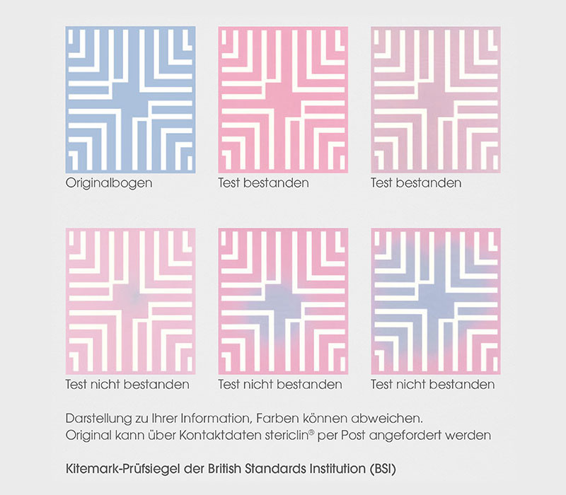Der steriCLIN Bowie & Dick Testbogen erfüllt die Vorgaben der DIN EN ISO 11140-4 zur Sterilisation von Produkten für die Gesundheitsvorsorge und sollte täglich, mindestens aber einmal je Woche durchgeführt werden. Dieser Schnelltest erhielt für mehrere Produkte vom Bundesamt für Sicherheit in der Informationstechnik eine Zertifizierung und das BSI-Kitemark Prüfsiegel.