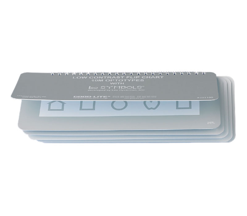 Die Symbole sind in gemischter Optotypenanordnung dargestellt, um das Raten auszuschließen. Die Untersuchung ist für Kinder, Analphabeten und geistig behinderte Patienten geeignet. Das Set erlaubt eine verlässliche Einschätzung der Sehstärke unter verringertem Kontrast.